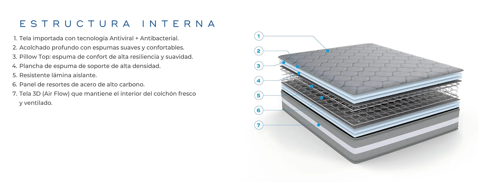 6. Tela 3D (Air Flow) que mantiene el interior del colchón fresco y ventilado