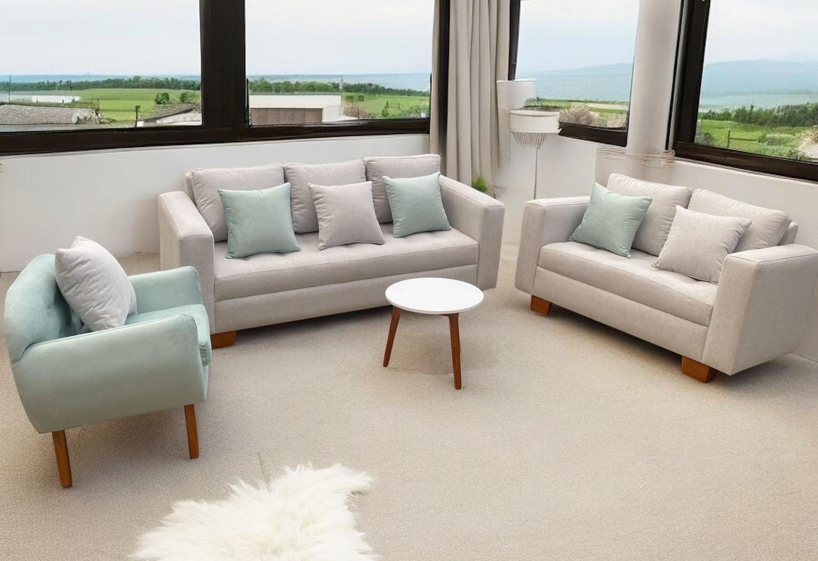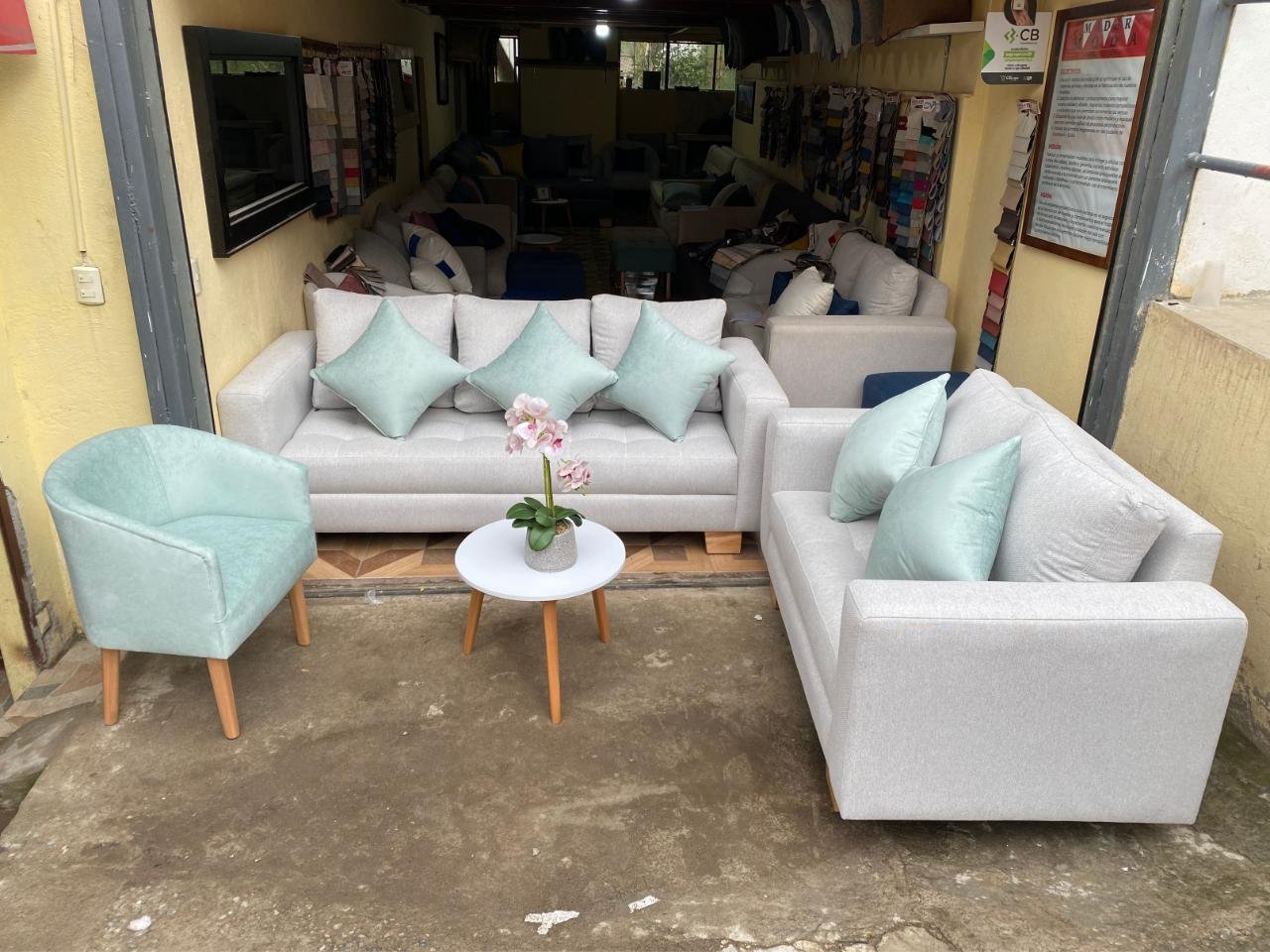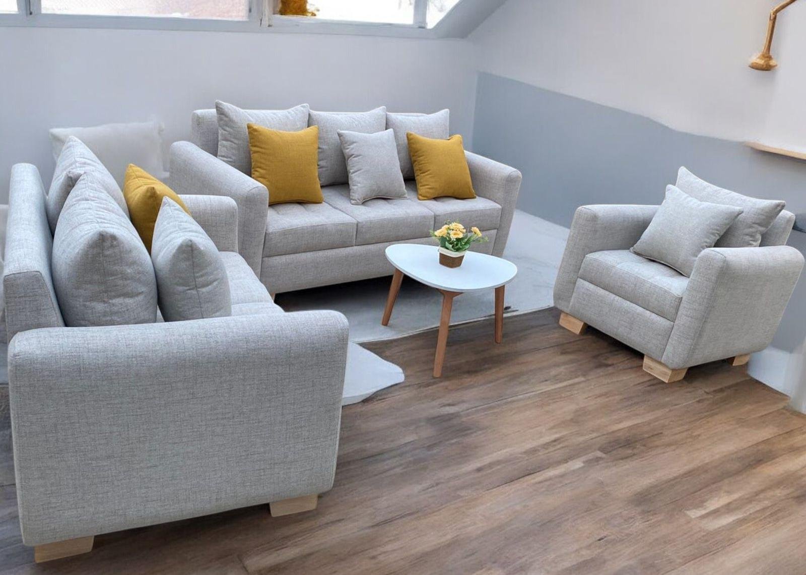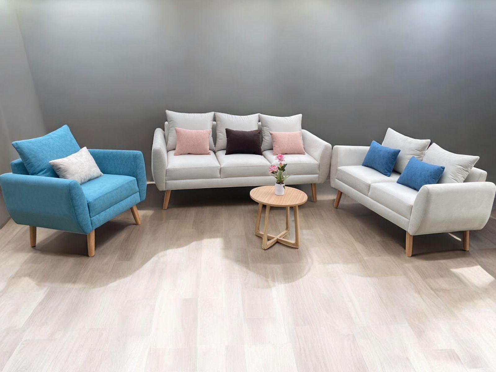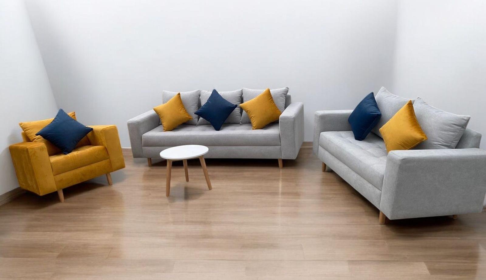 Juego de sala incluye sillón triple, doble e individual más mesa de centro ovalada o redonda en diámetro de 50cm y 6 cojines