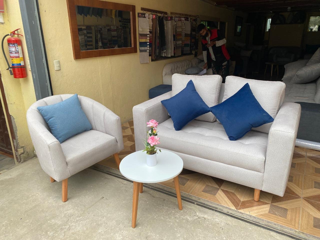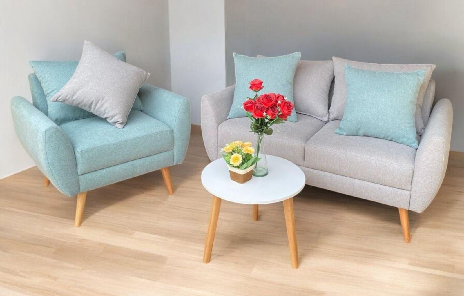 Minisala un sillón doble y un individual, mesa de centro diámetro de 40 cm y 3 cojines