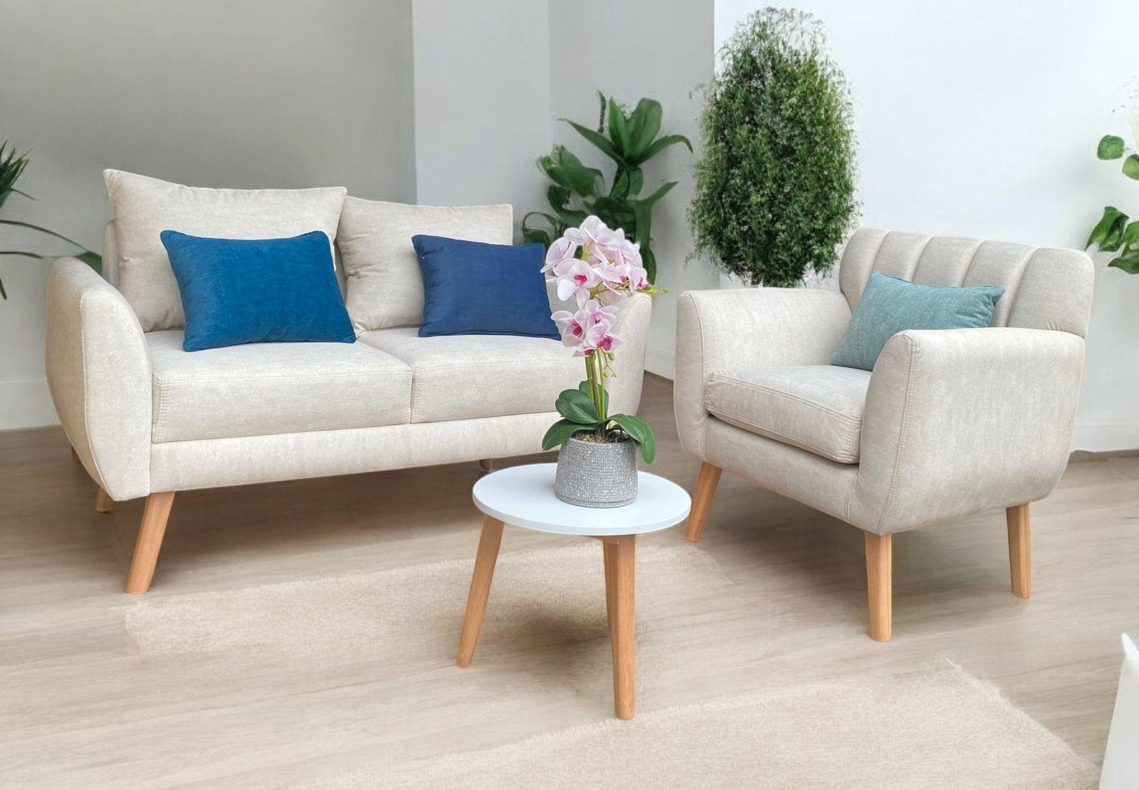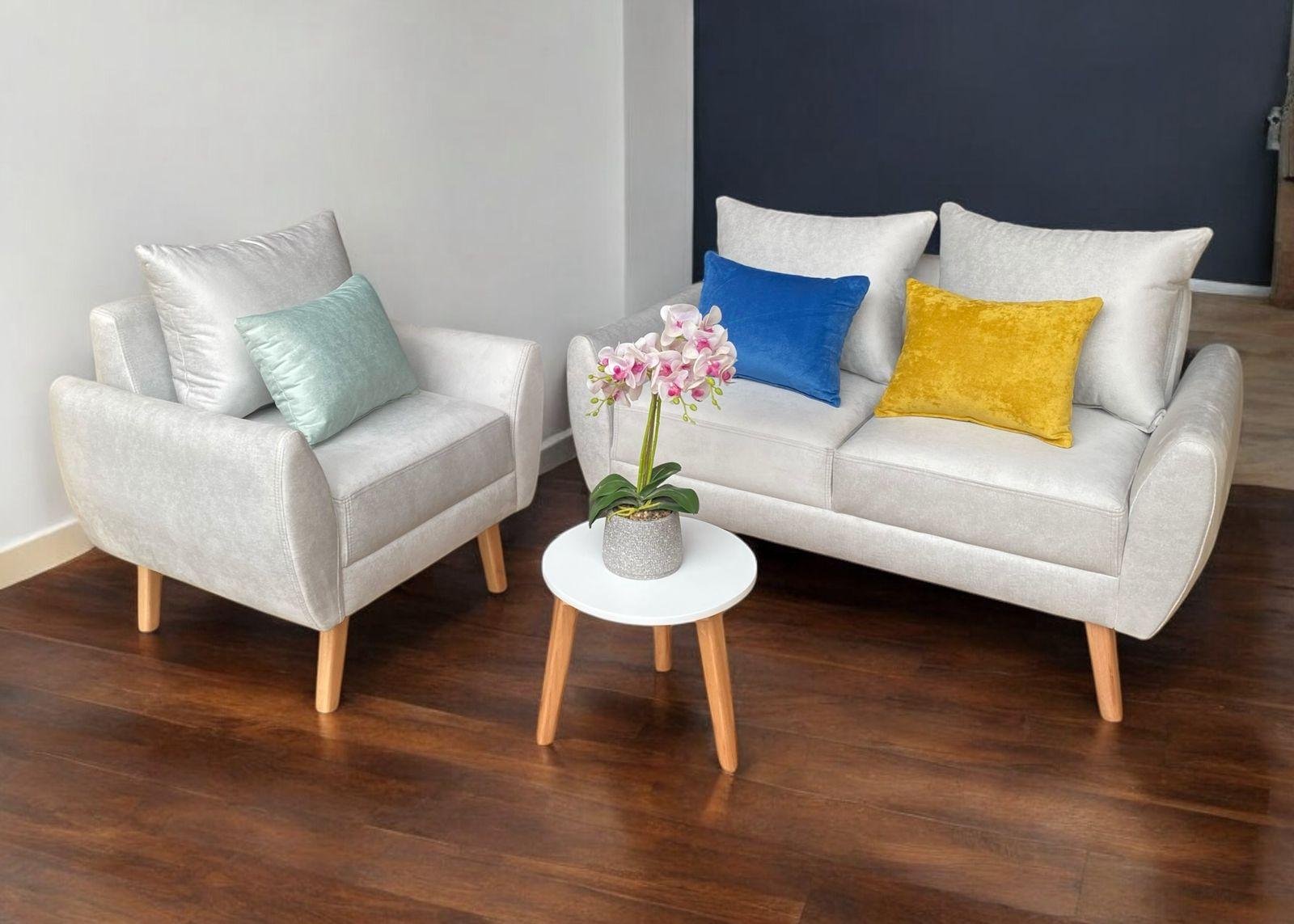 Minisala funcional que incluye sillones, mesa de centro y cojines decorativos. Fabricada en madera Copal con esponja Chaide densidad 25. Tapiz a elección. Entrega en 2 a 5 días laborables. Garantía de 1 año.