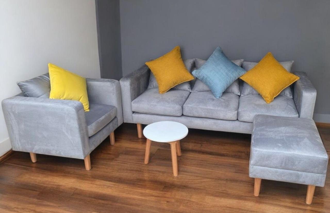Minisala funcional que incluye sillones, mesa de centro y cojines decorativos. Fabricada en madera Copal con esponja Chaide densidad 25. Tapiz a elección. Entrega en 2 a 5 días laborables. Garantía de 1 año.