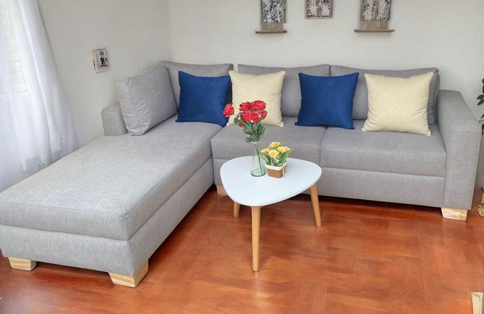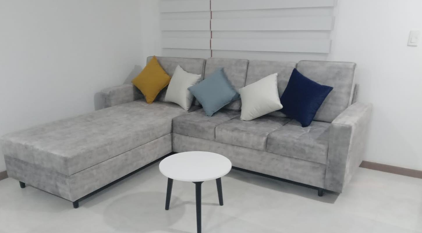 Diseño moderno en L o convertible, fabricado con estructura de madera Copal y esponja Chaide. Incluye cojines decorativos y mesa de centro (redonda o rectangular). Tapiz personalizable. Entrega en 2 a 5 días. Garantía de 1 año.
