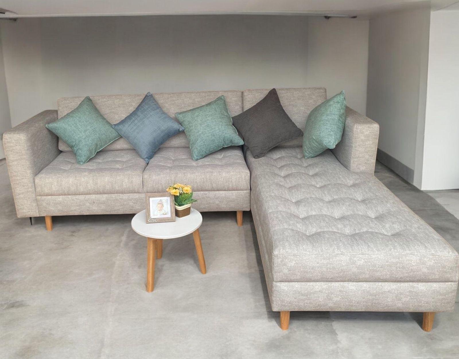 Sala en L medidas de 250cm x 180cm, incluye mesa de centro Ovalada o redonda de 50 cm de diámetro y 5 cojines