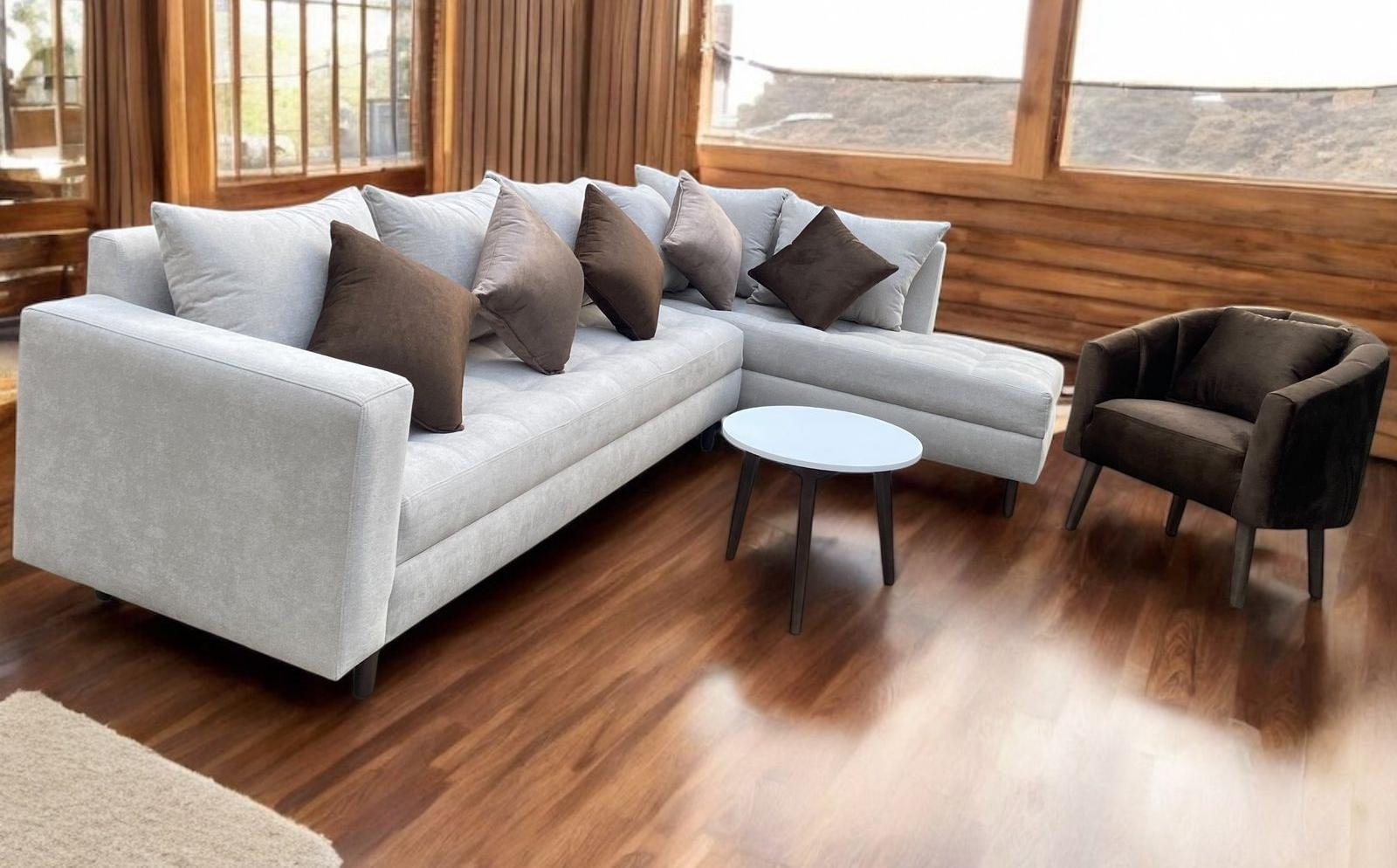 Diseño moderno en L o convertible, fabricado con estructura de madera Copal y esponja Chaide. Incluye cojines decorativos y mesa de centro (redonda o rectangular). Tapiz personalizable. Entrega en 2 a 5 días. Garantía de 1 año.